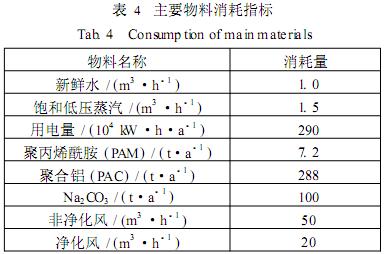 ②藥劑費。a.PAM投加量為2.739g/m3,PAM單價按16000元/t計,則PAM投加成本為0.044元/m3;b.聚合鋁投加量為109.6g/m3,PAC單價按2000元/t計,則PAC投加成本為0.219元/m3;c.Na2CO3投加量為38.05g/m3,Na2CO3單價按1300元/t計,則Na2CO3投加成本為0.049元/m3。綜上,噸水直接運行成本為1.08元/m3。