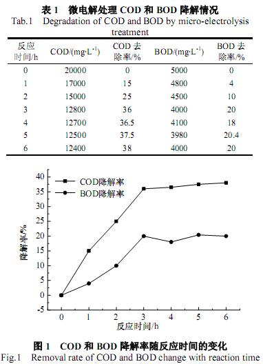 鐵-碳顆粒之間存在著電位差形成了無數(shù)個細微原電池,這些細微電池是以電位低的鐵成為陰極,電位高的碳做陽極,在廢水水溶液中發(fā)生電化學反應。反應的結(jié)果是鐵受到腐蝕變成二價的鐵離子進入溶液。由于鐵離子與氫氧根作用形成了具有混凝作用的氫氧化亞鐵,它與污染物中帶微弱負電荷的微粒異性相吸,形成比較穩(wěn)定的絮凝物(也叫鐵泥)而去除。因為一些難降解的大分子被碳粒所吸附或經(jīng)鐵離子的絮凝而減少,因此,經(jīng)微電解后,BOD/COD升高了,有利于廢水后續(xù)的生化處理。調(diào)高pH的目的是鐵的絮凝作用可凝聚廢水中的懸浮物,降低COD。微電解試驗的結(jié)果見表1和圖1。
