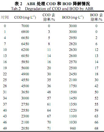微電解后的水加入適量的水稀釋,不斷更換進水COD濃度,使ABR反應器處理效果穩(wěn)定后,考察進水COD7000mg/L,BOD3000mg/L。連續(xù)進水10d,停留時間50h。處理效果見表2和圖2。