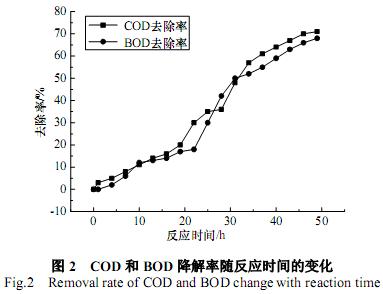 由圖2可以看出,COD和BOD的去除率隨時間延長不斷增加,反應時間25h時,COD去除率為35%以上,BOD去除率在30%以上;反應進行到第46h時,COD去除率已達到70%左右,BOD去除率達到68%,BOD/COD=0.47,已基本為后續(xù)的進一步生活處理奠定了基礎。具體參見http://www.xhxdt.com更多相關技術文檔。