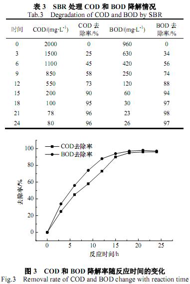 ABR出水進入SBR反應器,停留時間為24h,廢水處理結(jié)果見表3和圖3。