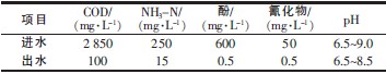 包鋼焦化廠現有10 座焦爐,焦炭年生產能力465 萬t,有焦化廢水處理站2 座,其中第二廢水處理站處理規模為350 m3/h,屬于國內大型焦化廢水處理設施之一。第二廢水處理站于2007 年底投產,采用A/O2 法生物脫氮工藝,其廢水主要來源于蒸氨廢水、焦化副產品回收及精制過程中產生的廢水、煤氣管道水封排水以及包鋼燃氣輪機發電系統廢水等。其設計進出水水質如表1 所示。