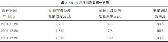 采用氨吹脫+生物處理+臭氧氧化工藝處理垃圾填埋場垃圾滲濾液具有處理效率高、操作簡便、投資省、運行費用低等優點。經過半年多的實踐運行證明:該工藝對滲濾液中氨氮去除效果穩定,對于氨氮濃度高達2000~2500mg/L的滲濾液,處理后出水可降至2~10mg/L,生活垃圾滲濾液排放達到一級標準,氨氮去除效率達99%以上;處理后的滲濾液出水CODcr指標也能達到生活垃圾滲濾液排放二級標準要求。