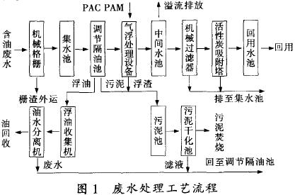 機械過濾器和活性炭吸附塔定期進行反沖洗,反沖洗水排入調節隔油池。調節隔油池的油污泥和氣浮設備產生的浮渣定期排放進入污泥池,油污泥用污泥泵提升至污泥干化床進行干化處理,干化后的污泥運送至鍋爐房焚燒。工藝流程見圖1。