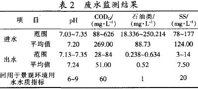 該工程自2005年12月調試成功以來,運行穩定.出水水質良好.長沙縣環境保護監測站2006年2月對該工程進、出水水質的監測結果見表2。