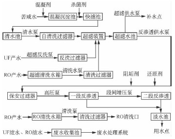 該工程由深圳恒通源水處理科技有限公司設計并承建,工藝主要為前處理系統(tǒng)、超濾系統(tǒng)、反滲透系統(tǒng)等,工藝流程如圖1所示。
