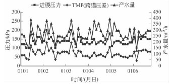圖2 超濾系統(tǒng)進膜壓力、TMP、產(chǎn)水流量曲線