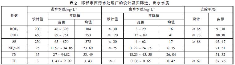邯鄲市西污水處理廠的設(shè)計(jì)及實(shí)際進(jìn)、出水水質(zhì)如表2所示。