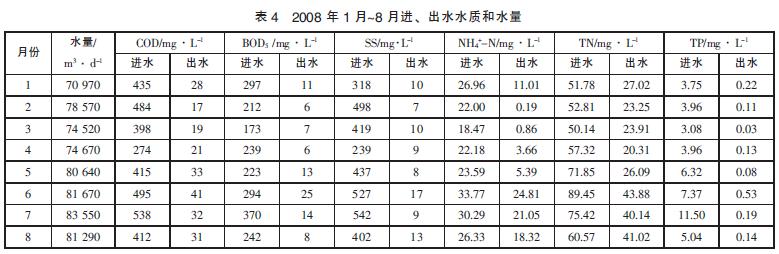 目前該廠所接納的城市污水中約65% 為生活污水, 2008 年部分月份的實(shí)際運(yùn)行結(jié)果見(jiàn)表4。運(yùn)行中發(fā)現(xiàn), 2008 年4 月底, 由于配套管網(wǎng)收集水量增加, 使得該氧化溝系統(tǒng)的進(jìn)水水質(zhì)、水量發(fā)生突變,加之后期雨季的影響, 對(duì)氮的處理效果有所降低, 但其出水仍可達(dá)標(biāo)。具體參見(jiàn)http://www.xhxdt.com更多相關(guān)技術(shù)文檔。