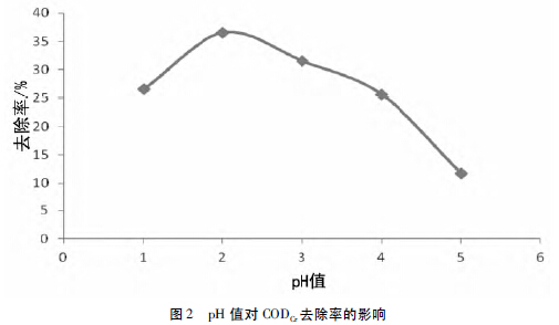 取60mL 稀釋過的水樣于五個燒杯中,分別加入相同量的NaCl 0.012 g(200 mg /L) ,鐵粉量1.2g(20g /L) ,用鹽酸調節溶液的pH 值,使五個燒杯中溶液的pH 值依次為1,2,3,4,5,攪拌30 min 后測定各水樣CODCr值,結果見圖2。
