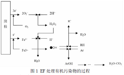 在electro- Fenton 中,溶液中的Fe3+ 可通過反應(3)在陰極還原成Fe2+。圖1 說明了在設想的催化循環中,EF 處理的有機污染物結構圖[1]。Qiang[3]等指出Fe2+ 再生將受到電極電勢和面積、PH、溫度和催化劑量的影響。Oturan[4]等通過分別用0.2mm的Fe2+ 和Fe3+ 作催化劑,在Pt/ 碳氈作電極,60mA 的不分離電解池條件下降級孔雀綠,結果表明二者具有相同的降解速率。這說明在三維碳制材料下,Fe2+ 和Fe3+ 均可作為催化劑的來源。
