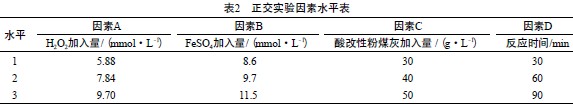 對(duì)正交實(shí)驗(yàn)結(jié)果進(jìn)行極差分析,得出各因素對(duì)COD影響的大小順序?yàn)椋篐2O2加入量> FeSO4加入量>反應(yīng)時(shí)間>酸改性粉煤灰加入量。較適宜的反應(yīng)條件為:H2O2加入量7.84 mmol/L,F(xiàn)eSO4加入量8.6 mmol/L,酸改性粉煤灰加入量30 g/L,反應(yīng)時(shí)間60min。