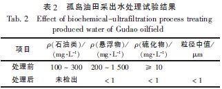 勝利油田孤島采油廠對此項技術進行了試驗研究。三相來水經沉降罐除油后進入冷卻塔冷卻,出水流入微生物反應池,利用池中特種菌群降解污水中的有機物和油類等污染物質,使得污染物質在生化池中轉化為簡單的無機物,再經過有機管式膜,去除粒徑大于0.22 μm 的非溶解性固體,使處理后水質達到A1 標準,孤島油田采出水處理試驗結果如表2 所示。該工藝適用于處理低滲透油藏中懸浮物的質量濃度小于1 500 mg/L,油的質量濃度小于300 mg/L 的污水。