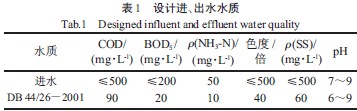 該集中式廢水處理廠采用混凝- 生物接觸氧化工藝,設計規模為46×103 m3/d,其中一期工程規模為12×103 m3/d,二期工程規模為34×103 m3/d。總投資約為4 000 萬元。設計進、出水水質見表1。