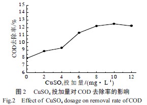 取8 份一定量的水樣,調節廢水pH 為5.5,控制固定化漆酶投加量為0.2 g/L,控制CuSO4投加量分別為0、2、4、6、8、10、12 mg/L,控制HBT 介體投加量為4 mg/L,在25 ℃條件下曝氣反應一段時間后測定不同CuSO4投加量對廢水COD 的影響,從而確定最佳CuSO4投加量。CuSO4投加量對COD去除率的影響如圖2 所示。