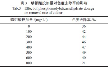 由表3 可知,當磷鉬酸的投加量為500 mg/L時可達到最大的脫色率,繼續增大磷鉬酸投加量,去除率反而下降。分析原因可能為兩方面,一方面因為大量的介體自由基氧化漆酶活性基團,導致酶活下降,去除率降低。另一方面,對于一些HPC,特別是Mo 系HPC,作為一種強氧化劑在一定條件下容易轉變為更為穩定的還原態,而還原態自由基呈深藍色,導致廢水色度又升高。