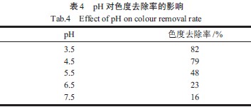 由表4 可知,隨著pH 的升高,色度去除率呈下降趨勢,在pH 為3.5 時具有最高的色度去除率,分析原因可能為酶的活性部分一般含有酸性或堿性基團,這些基團因外界pH 的變化處于不同的離解狀態,即酶和底物結合的程度不同,所以導致酶所發揮的效應也不同。在與草漿二沉出水反應時最佳反應pH 為3.5,前面固定化漆酶酶學性質研究中最佳反應pH 有所不同,分析原因可能為與漆酶作用的底物不同,其最佳反應pH 也不同。