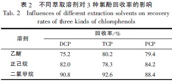 取DCP、TCP 和PCP 的質量濃度均為0.08mg/L 的加標樣品,用20 mL 的乙醚、正已烷和二氯甲烷分2次萃取,在其它條件相同的情況下,考察3 種溶劑對萃取效果的影響。3 種氯酚的平均回收率(3次重復試驗的平均測定值)見表2。從表2可以看出,使用二氯甲烷萃取時效果最好。