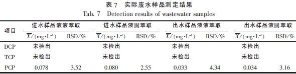 取某污水處理廠進水和出水樣品,用液液萃取-液相色譜法測定DCP、TCP 和PCP 濃度,同時按照《水和廢水監測分析方法》(第四版)固相萃取-液相色譜法對相同樣品進行測定,各重復測定7次,結果見表7。