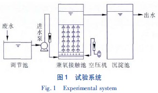 廢水經調節池后由進水泵從底部泵入兼氧接觸氧化池,處理出水從上部集水槽排入沉淀池,經沉淀后排出。兼氧接觸氧化池內懸掛彈性纖維組合填料,所需空氣由空壓機供給,通過穿孔管布氣。試驗系統如圖1 所示。