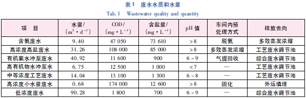 該企業(yè)共有6 個生產(chǎn)車間,主要產(chǎn)生7 類廢水,排放廢水總量約193m3/d。目前全廠實(shí)際排放廢水的水質(zhì)、水量情況見表1。其中,高濃度生產(chǎn)廢水排入廢水處理站前,先經(jīng)車間預(yù)處理系統(tǒng)(多效蒸發(fā)濃縮、氣提回收等)處理,使含鹽量降低至3 000mg/L 以下。