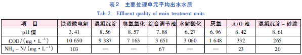 工藝廢水COD 濃度高、生物毒性大,同時使用鐵碳微電解和臭氧氧化進(jìn)行預(yù)處理,可有效降解苯環(huán)、雜環(huán)等各類難降解有機(jī)物,提高廢水可生化性,降低后續(xù)生物系統(tǒng)的有機(jī)負(fù)荷。微電解后串聯(lián)混凝工藝,一方面是可以去除懸浮性和膠體性有機(jī)物,且充分發(fā)揮微電解過程中所產(chǎn)生的Fe2+和Fe3+的混凝作用,節(jié)省混凝劑的用量,與此同時,F(xiàn)e3+通過剩余污泥排出系統(tǒng),避免廢水中過多的Fe3+對微生物的活性形成抑制; 另一方面,懸浮物的大量去除可降低對臭氧氧化的不利影響。為提高出水水質(zhì),生物處理系統(tǒng)后面還增設(shè)了混凝沉淀和砂濾處理單元。
