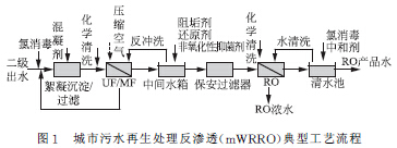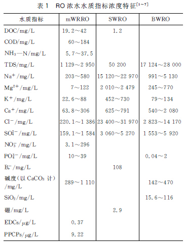 污水再生利用是解決水資源短缺的重要戰略和必要途徑。但是城市污水成分復雜,除含有常規化學污染物外,還存在多種多樣的微量有毒有害化學污染物和致色致臭物質。由于城市污水再生處理反滲透(municipal wastewater reclamation reverse osmosis,mWRRO)系統對污水中有機物、病原微生物、硝酸鹽氮以及難降解有機物(如內分泌干擾物等)具有良好的去除效果,已逐漸在城市污水再生利用領域得到推廣利用。但是,mWRRO系統在生產高質量再生水的同時,會有副產物——RO濃水產生。