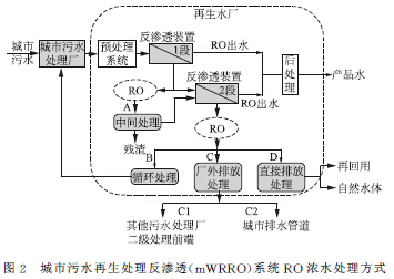 mWRRO系統RO濃水可根據不同處置目標選擇相應的處理方式,主要包括:中間處理方式(A):對于兩段mWRRO系統,將Ⅰ段RO濃水進行中間處理,處理后再進入Ⅱ段反滲透,以提高RO系統的產水率,減少Ⅱ段RO 濃水水量。循環處理方式(B):RO濃水經過一定的處理后回流至城市污水處理廠生物處理。廠外排放處理方式(C):RO濃水經過一定的處理后就近排入其他污水處理廠二級處理前端(C1),或達到排入城市下水管道要求后,排入城市排水管道系統(C2)。直接排放處理方式(D):RO濃水經過處理后,可廠區內再回用,或者外排至河道及其他自然水體。