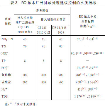 若出水就近排入其他城市污水處理廠二級處理單元,RO濃水的廠外排放處理方法的選擇,除了考慮表2所述排放限值外,需要結合污水處理廠的稀釋容量,考慮生化單元微生物對有機物、氮、磷和無機營養鹽的濃度要求,以及鹽度對污泥處置的影響。