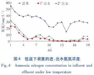 正常水溫試驗期間2 組裝置的進、出水氨氮濃度見圖2。