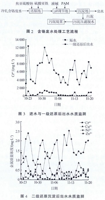 自2011 年10 月23 日,上海某工業廢水處理廠在實驗小試基礎上正式投入試運行處理該鋼鐵廠產生的含鉻廢水,日處理量為10 t,采用圖2 所示工藝流程,并對進水水質及兩級還原后出水水質進行了監測,結果見圖3、圖4。