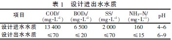根據該淀粉廠的實際情況,參照同類型企業的廢水水質,本著處理效果好﹑運行成本低﹑投資省的原則對該廠的污水處理工程進行設計,設計處理水量為480 m3/d,設計出水水質須滿足《污水綜合排放標準》(GB 8978—1996)中的一級排放標準要求。設計進出水水質見表1。