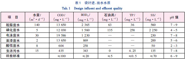 某汽車公司車架車間年產車架12 萬架,生產廢水量約為200m3/d,主要包括脫脂廢水、磷化廢水、陽極電泳廢水、面漆廢水和充電房酸性廢水。車架車間生產廢水具有種類繁多、成分復雜、排放無規律、水質水量波動大的特點,其中脫脂廢水主要含有乳化油、COD、LAS、SS、磷酸鹽等;磷化廢水主要含有SS、磷酸根、硝酸鹽、亞硝酸鹽及少量金屬離子Zn2 +、Ni2 + 等;陽極電泳廢水主要含有SS、有機溶劑、油脂、樹脂、皂類、無機鹽等;面漆廢水主要含有大量漆物顆粒、硝基漆、氨基漆、醇酸漆、環氧漆、乙醇、丙酮、酯類、苯類等;充電房酸性廢水主要含有62 酸(硫酸)。本著盡量減少工程投資、降低處理難度和運行成本的原則,經過多方調研論證,最后確定采用預處理/氣浮/水解酸化/接觸氧化處理工藝,設計處理規模為200m3/d,出水水質要求達到《污水綜合排放標準》(GB 8978—1996) 的一級標準。具體設計進、出水水質見表1。