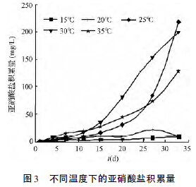 將數月前做好的載體放置于反應器中,溫度分別控制在15、20、25、30 和35℃下。在圖3 中,最初階段NO2-濃度都在10 mg /L 以下,表明載體存放時間過長會造成AOB 活性降低,因此要注意載體存放的條件,可加少許營養液,維持微生物的活性。此實驗過程可以看作是AOB 再次馴化的過程,更能體現溫度對AOB 與NOB 活性的影響。