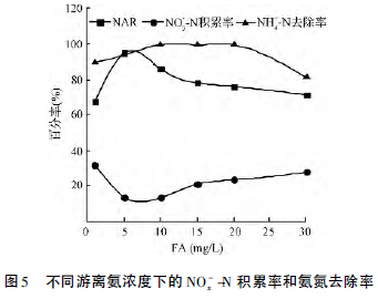 實驗結果如圖5 所示,NAR隨著FA 的濃度增加先升高,在FA = 6.5 mg /L,NAR為97%,達到最大值后又開始下降,但硝酸鹽積累率隨著FA 濃度的增加先減低后升高,說明高濃度FA 條件下,會抑制AOB 的活性,對NOB 的抑制效果不明顯,同時,NOB 會逐漸適應高濃度的FA。在FA = 10~20 mg /L 之間,氨氮去除率高達99%,NAR在此FA 濃度范圍內是下降的,而NO3--N 積累率卻是上升的過程,由此可見,NOB 氧化了短程硝化產生的NO2-。因此高濃度FA 條件下造成NAR降低的原因有2 個: 一是高濃度FA 會抑制AOB 的活性,減少NO2-的生成量; 一是NOB 活性未受抑制,利用NO2-為底物,將其氧化成NO3-。綜上所述,高濃度FA 會阻礙短程硝化的進程,但是由于NOB 的活性未受抑制,仍然可以取得穩定的NAR和較高的氨氮去除率。