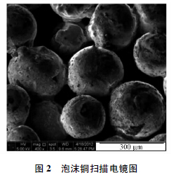 泡沫銅電極由銅粉末微粒燒結(jié)后還原而成.如圖2 泡沫銅電極的SEM 圖所示,經(jīng)燒結(jié)后,依然保持銅粉微粒形貌,微粒間粘連,大部分熔融導(dǎo)通,形成介孔材質(zhì).經(jīng)萬用表測量,泡沫銅電極表面電阻接近于零,具有極低的電阻.與銅板電極相似,都屬于優(yōu)良的導(dǎo)體.