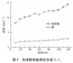 常規(guī)的氣體擴散電極,氣體與極板只經(jīng)過一次碰撞,所含O2與極板上電子接觸幾率較低.而這種多孔的泡沫銅電極,氣體穿過微粒間孔隙時,與微粒表面多次碰撞,O2與電子的接觸幾率成倍提高.觀察泡沫銅氣體擴散電極的氣泡,發(fā)現(xiàn)氣泡較小且均勻,說明這種內(nèi)部曝氣效果也較好,氣體擴散均勻且強度較高.因此,綜合上述幾點,相比普通的平面銅電極,泡沫銅電極氣體擴散電極具有更高的H2O2產(chǎn)率.
