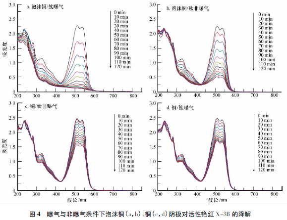 實驗對普通銅陰極與泡沫銅陰極的降解效果進行了對比,無論是采用傳統(tǒng)電解與氣體擴散電解方式,兩者都存在明顯的差異.如圖4(c) 所示,銅電極傳統(tǒng)電解120 min 內(nèi)去除率僅約34%,而銅電極氣體擴散電解也僅約38%,均遠低于相同條件的泡沫銅電極.這一方面與施加的電壓過低有關(guān),另一方面是由于泡沫銅電極具有銅電極更大的比表面積,更加適宜作為降解電極使用.對比圖4(c) 與圖4(d),普通銅電極采用傳統(tǒng)電解與氣體擴散電解方式,其在236 nm 、285 nm、329 nm 處即苯環(huán)結(jié)構(gòu)、三嗪結(jié)構(gòu)和萘環(huán)降解差異不明顯,這與2.1 中銅電極氣體擴散電解H2O2產(chǎn)率不高相符.可見,泡沫銅不僅可以大幅降低電解電壓,還能在曝氣條件下高效原位生成H2O2,用于降解活性艷紅X-3B,是較理想的氣體擴散電極材料.