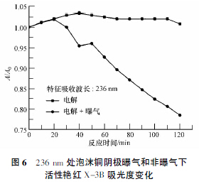 由圖6 可見,泡沫銅電極傳統(tǒng)電解時, 120 min 內(nèi)236 nm 處吸光度幾乎不變,表明普通電解下,難降解有機物無法有效降解.這主要是由于采用的降解電壓過低,雖然泡沫銅電極為良導(dǎo)體,但在僅2 V 電壓下,實際陽極氧化有機物的過電位仍不高,對難降解有機物的降解能力有限.而泡沫銅氣體擴散電解120 min 內(nèi)236 nm 段的降解率仍能達到21.5%,這是產(chǎn)生的H2O2進一步分解產(chǎn)生的·OH參與降解,其氧化還原電位高達2.85 V,遠高于普通電解所能提供的2 V,且新產(chǎn)生的·OH活性很強,能有效破壞苯環(huán)結(jié)構(gòu),降解難降解有機物.