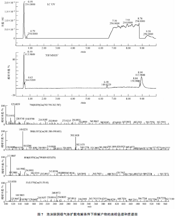 實驗采用LC-TOF MS 對氣體擴散電極降解活性艷紅X-3B 的產(chǎn)物進行了檢測,結(jié)果如圖7.