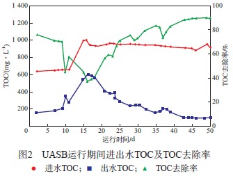 UASB運(yùn)行期間進(jìn)出水TOC及TOC去除率見圖2。