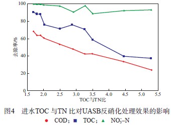 2.2 進(jìn)水TOC 與TN 比對UASB反硝化處理效果的影響