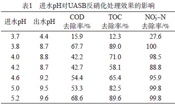 進(jìn)水pH對UASB反硝化處理效果的影響見表1。由表1可見:當(dāng)進(jìn)水pH為3.8~5.2時,COD去除率為42.2%~68.6%,TOC去除率為58.1%~89.6%,NO3--N去除率為88.8%~100%;當(dāng)進(jìn)水pH為3.7時,出水pH為4.4,COD去除率只有15.9%,TOC去除率為12.3%,NO3--N去除率為27.6%,反硝化反應(yīng)無法順利進(jìn)行;隨著進(jìn)水pH的升高,出水pH也逐漸升高。由于本工作需要對UASB出水進(jìn)行進(jìn)一步的好氧生化處理,為保證后續(xù)處理的順利進(jìn)行,UASB進(jìn)水pH可調(diào)節(jié)為4.5左右。