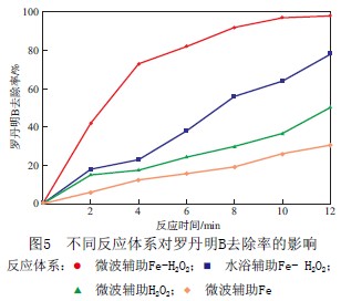 由圖5可見,在水浴輔助Fe-H2O2、微波輔助H2O2和微波輔助Fe體系中各反應(yīng)12 min后,羅丹明B去除率分別達到78.1%,50.2%,30.8%,遠遠低于微波輔助Fe-H2O2體系對羅丹明Bz的去除率,可見微波對Fe-H2O2處理羅丹明B的去除具有較強的輔助作用。