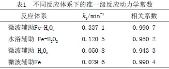 對不同反應(yīng)體系中羅丹明B的去除反應(yīng)進行了動力學(xué)擬合,結(jié)果為準一級動力學(xué)。不同反應(yīng)體系下的準一級反應(yīng)動力學(xué)常數(shù)見表1。由表1可見,微波輔助Fe-H2O2體系降解羅丹明B的k1遠遠大于其他反應(yīng)體系。在微波的作用下,降低了微波輔助Fe-H2O2體系的反應(yīng)活化能,并且使Fe和H2O2反應(yīng)加快,促進羥基自由基的生成,加速羅丹明B的去除。