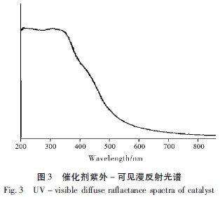 圖3 為催化劑的UV-Vis 吸收光譜。從圖中可以看出在可見光區域400 ~ 800 nm 范圍內都有較明顯的可見光吸收現象,說明催化劑的確在可見光區域有很好的光吸收活性。已有的研究表明,在I 摻雜的TiO2晶體結構中,其在400 ~ 475 nm 范圍內較明顯的可見光吸收現象可歸結為I 元素摻雜入TiO2后,可在TiO2的禁帶內形成能夠吸收可見光的雜質能級,從而拓展TiO2光吸收偏向可見光區轉移。