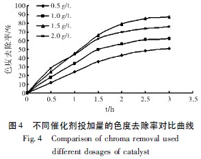 分別投加0. 5 g /L,1. 0 g /L,1. 5 g /L 及2. 0 g /L 催化劑粉末,光照3 h 后測廢水的色度變化,結果見圖4。由圖4 可以看出,催化劑的投加量有一個最佳值1. 5 g /L,低于或高于這個最佳值,色度的去除率都會降低。也就是說,催化劑的投加量并不是與光催化的效果成正比。這是因為當催化劑投加量過少,則有效光子不能完全轉化為化學能; 但若投加量過多時,又會使水中的濁度增大,影響光的透射,進而降低了光反應效率,且還容易導致催化劑顆粒的團聚,使得催化劑比表面積變下,減少了反應活性位。