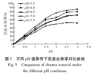 原水的pH 值約為6. 5,再調節廢水pH 值分別為5. 5、6. 0、7. 0 和7. 5,均投加催化劑量為1. 5 g /L,光照反應3 h 測定的廢水色度去除率見圖5。