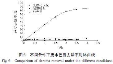 為評價I-TiO2光催化去除炒貨食品加工廢水色度的實際性能,消除催化劑吸附及光分解造成色度下降的影響,本研究分別比較了暗態吸附、純光照和光催化試驗的色度去除效果,結果見圖6。