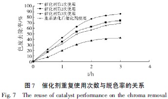 由圖5 可知,在廢水原始pH 值6. 5 的弱酸性條件下其色度去除效率最高,即廢水不需調節pH 值; 酸性條件次之,堿性條件下效果最差。這可能是由于催化劑納米粒子在弱酸性條件下的分散效果最好,分散的越好,其受到的光照面積也就越大,產生的光生電子-空穴對也越多,則活性最好; 但若水溶液pH 值過低時,催化劑容易發生團聚現象,不利于其分散,所以催化效果也受到影響。